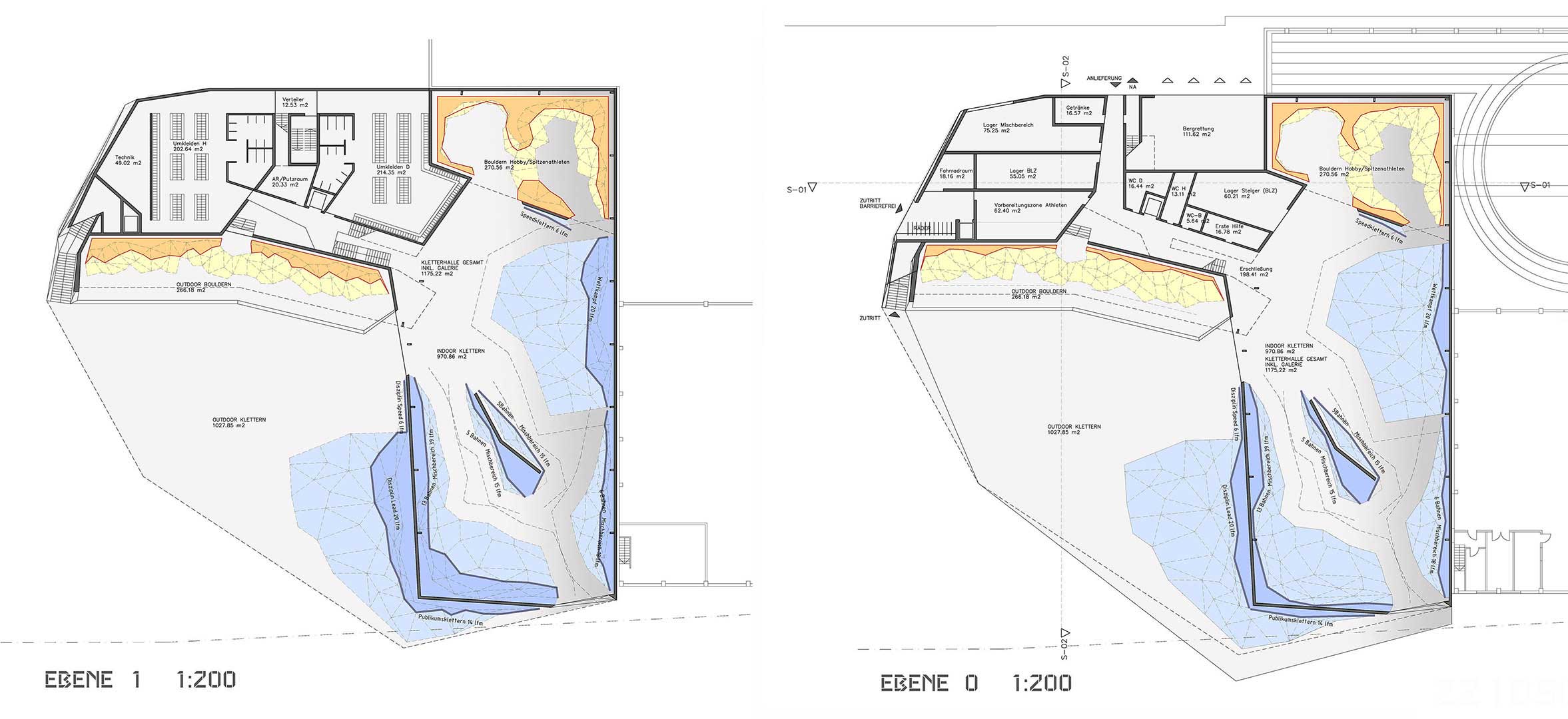 In order to take up as little floor space as possible for the climbing center, it makes sense to connect the outdoor area to the climbing hall under a roof, and to group the main functional units climbing outdoor, indoor climbing, as well as storage, cloakroom, foyer, administration and bouldering around a central axis.
