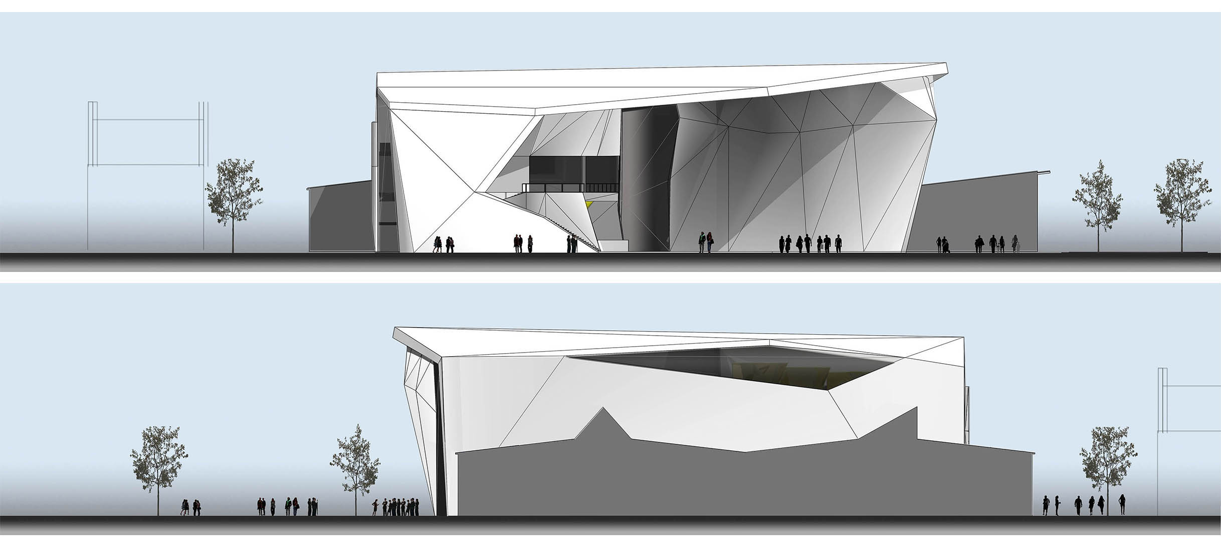 The smooth white roof and facade surface marks a clear contrast to the existing building. On closer inspection, the surface dissolves into geometric aluminum composite panels. These reflect the light and highlight and the crystalline structure of the building.